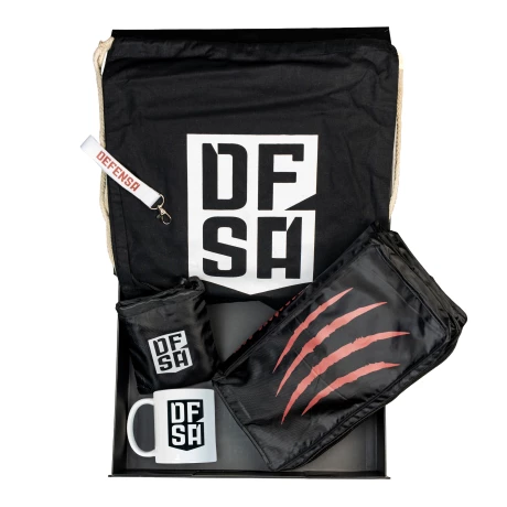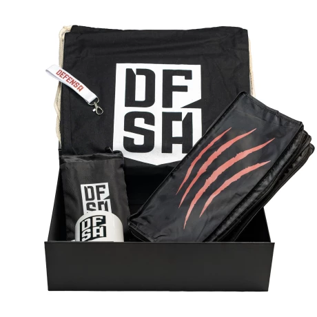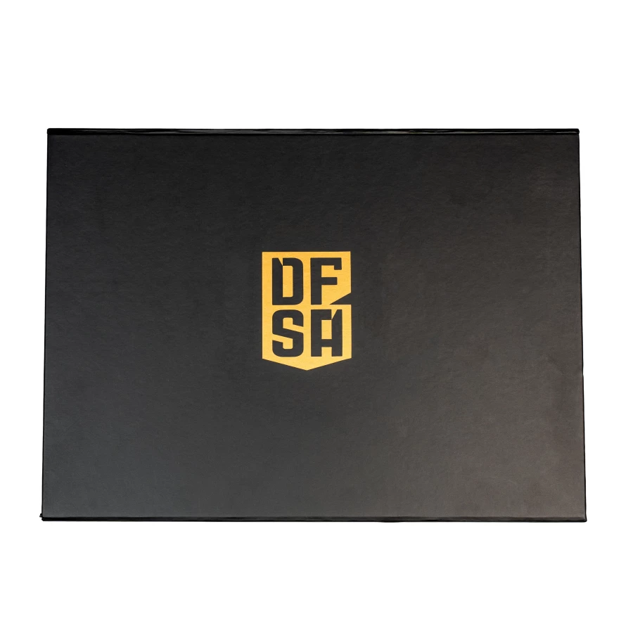 Defbox Defensa to pudełko premium stworzone z myślą o prawdziwych fanach bramkarskiego stylu. Wykonane z wysokiej jakości tektury 850 g/m², zapewnia trwałość i luksusowy wygląd, a magnetyczne zamknięcie dodaje komfortu użytkowania. Całość utrzymana jest w głębokiej czerni, a wierzch zdobi złote logo Defensa, które podkreśla prestiż produktu.